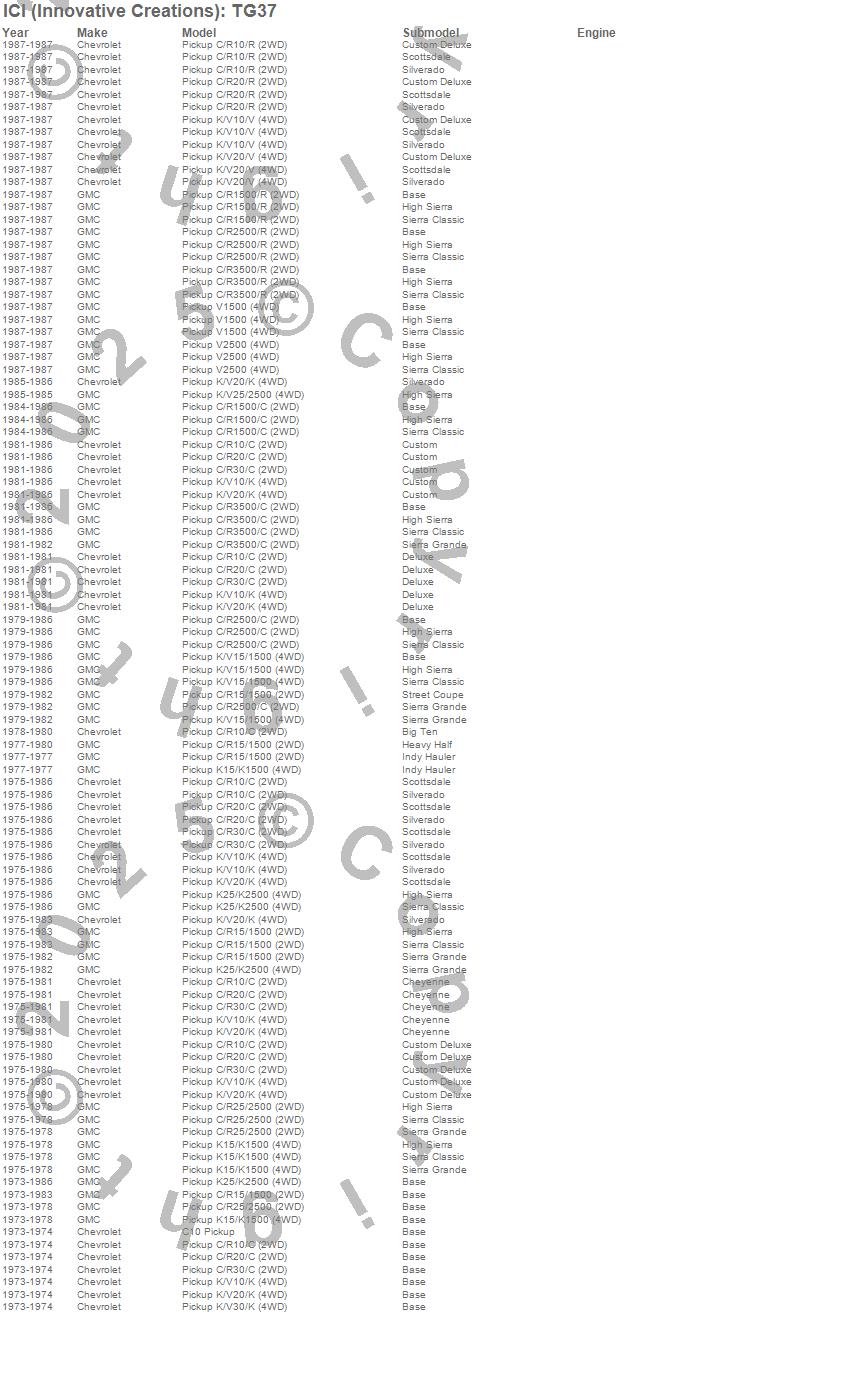 Below is an abbreviated list of applications for the Tailgate Protector.C10 Pickup, C1500 Pickup, C20 Pickup, C25/C2500 Pickup, C2500 Pickup, K10 Pickup, K1500 Pickup, K20 Pickup, K25 Pickup, K25/K2500 Pickup, K2500 Pickup, R10 Pickup, R20 Pickup, V10 Pickup, V20 Pickup, Chevrolet, GMC, 1988, 1987, 1986