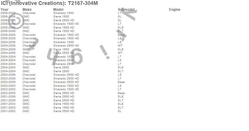 Below is an abbreviated list of applications for the Rocker Panel Molding.Sierra 1500, Sierra 1500 HD, Sierra 2500, Sierra 2500 HD, Silverado 1500, Silverado 1500 HD, Silverado 2500, Silverado 2500 HD, Chevrolet, GMC, 2006, 2005, 2004, 2003, 2002, 2001