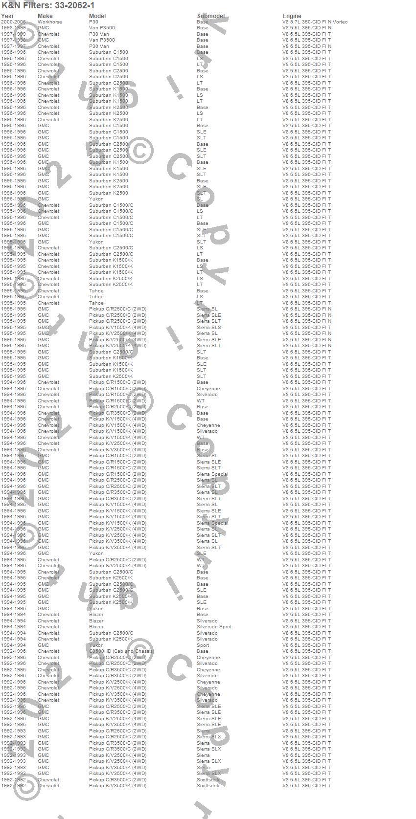 Below is an abbreviated list of applications for the Air Filter.Blazer, C1500 Pickup, C1500 Suburban, C2500 Pickup, C2500 Suburban, C3500 Pickup, C3500HD, K1500, K1500 Pickup, K1500 Suburban, K2500 Pickup, K2500 Suburban, K3500 Pickup, P30 Van, P3500 Van, Tahoe, Yukon, Chevrolet, GMC, 1999