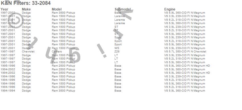 Below is an abbreviated list of applications for the Air Filter.Ram 1500, Ram 2500, Ram 3500, Dodge, 2002, 2001, 2000, 1999, 1998, 1997, 1996, 1995, 1994