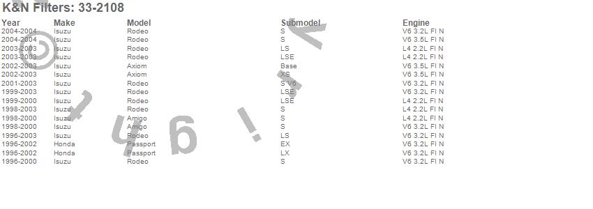 Below is an abbreviated list of applications for the Air Filter.Amigo, Axiom, Passport, Rodeo, Honda, Isuzu, 2004, 2003, 2002, 2001, 2000, 1999, 1998, 1997, 1996
