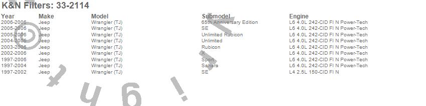 Below is an abbreviated list of applications for the Air Filter.TJ, Wrangler, Jeep, 2006, 2005, 2004, 2003, 2002, 2001, 2000, 1999, 1998, 1997