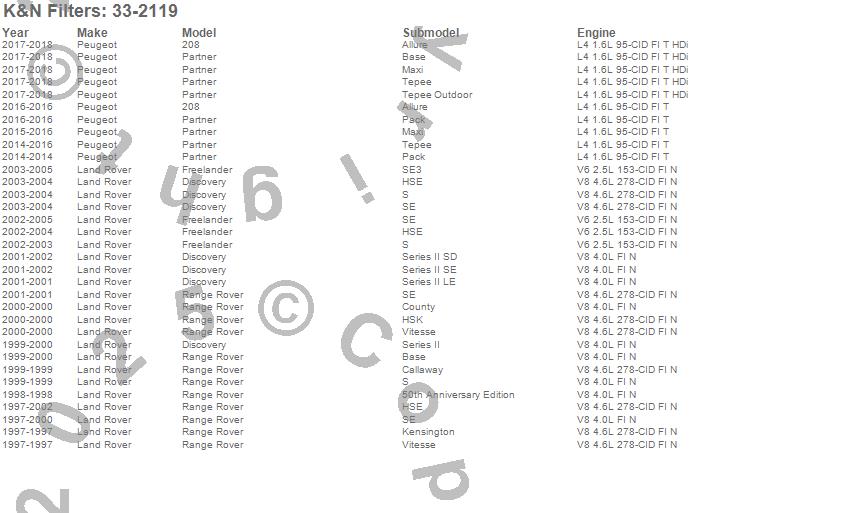 Below is an abbreviated list of applications for the Air Filter.208, Discovery, Partner, Range Rover, Land Rover, Peugeot, 2018, 2017, 2016, 2015, 2014, 2004, 2003, 2002, 2001, 2000, 1999, 1998, 1997