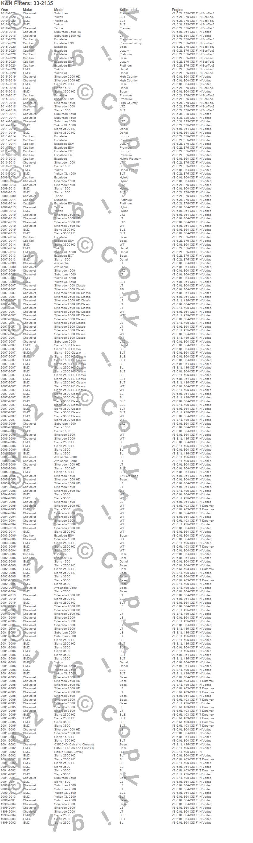 Below is an abbreviated list of applications for the Air Filter.Avalanche, Avalanche 2500, C3500 Pickup, C3500HD, Escalade, Escalade ESV, Escalade EXT, Sierra 1500, Sierra 1500 Classic, Sierra 1500 HD, Sierra 1500 HD Classic, Sierra 2500, Sierra 2500 HD, Sierra 2500 HD Classic, Sierra 3500, Sierra 3500 Classic, Sierra 3500 HD, Silverado 1500, Silverado 1500 Classic, Silverado 1500 HD