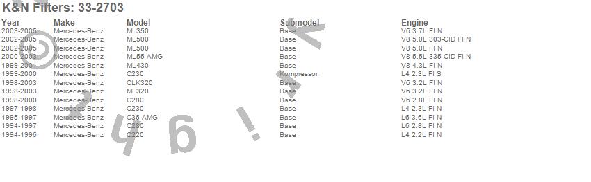 Below is an abbreviated list of applications for the Air Filter.C220, C230, C280, C36 AMG, CLK320, ML320, ML350, ML430, ML500, ML55 AMG, Mercedes-Benz, 2005, 2004, 2003, 2002, 2001, 2000, 1999, 1998, 1997