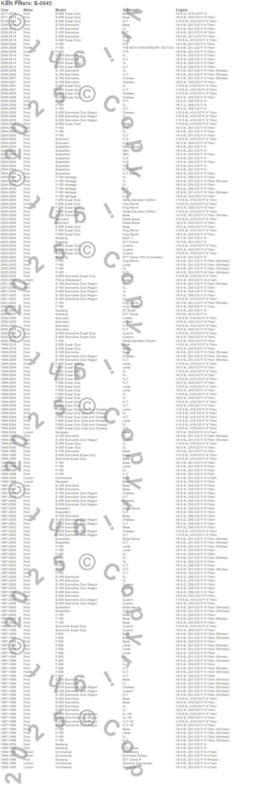 Below is an abbreviated list of applications for the Air Filter.Blackwood, Continental, E-150 Econoline, E-150 Econoline Club Wagon, E-250 Econoline, E-350 Econoline, E-350 Econoline Club Wagon, E-350 Super Duty, E-450 Econoline Super Duty, E-450 Super Duty, E-550 Econoline Super Duty, E-550 Super Duty, Econoline Super Duty, Excursion, Expedition, F-150, F-150 Heritage, F-250, F-250 Super Duty, F-350 Super Duty