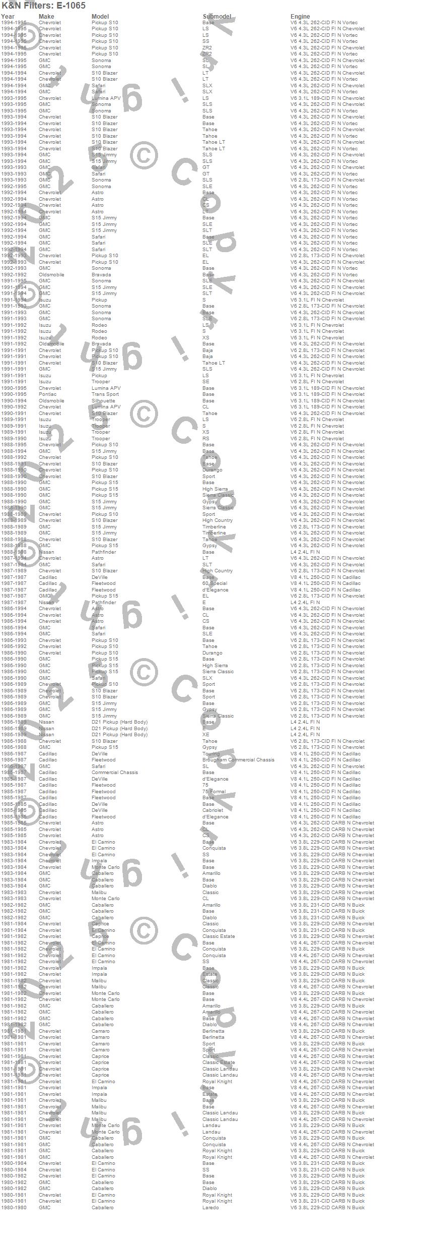 Below is an abbreviated list of applications for the Air Filter.Astro, Bravada, Caballero, Camaro, Caprice, Commercial Chassis, DeVille, El Camino, Fleetwood, Impala, Lumina APV, Malibu, Monte Carlo, Pickup, Rodeo, S10 Blazer, S10 Pickup, S15 Jimmy, S15 Pickup, Safari