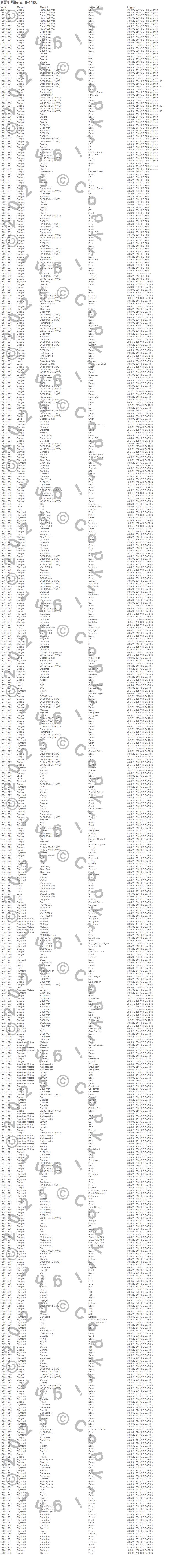 Below is an abbreviated list of applications for the Air Filter.440, A100 Pickup, A100 Van, Ambassador, Aspen, B100 Van, B150 Van, B1500 Van, B200 Van, B250 Van, B2500 Van, B300 Van, B350 Van, B3500 Van, Barracuda, Belvedere, Belvedere II, CB300 Van, Challenger, Charger