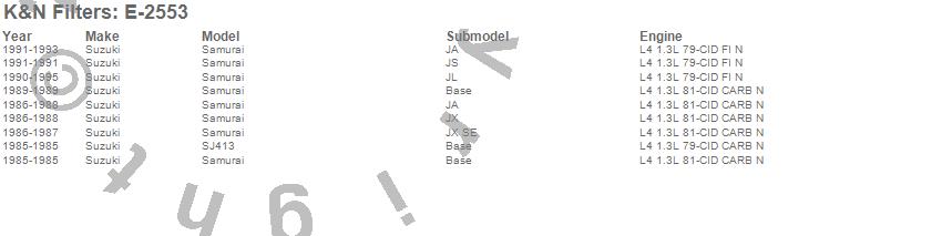 Below is an abbreviated list of applications for the Air Filter.Samurai, SJ413, Suzuki, 1995, 1994, 1993, 1992, 1991, 1990, 1989, 1988, 1987, 1986, 1985
