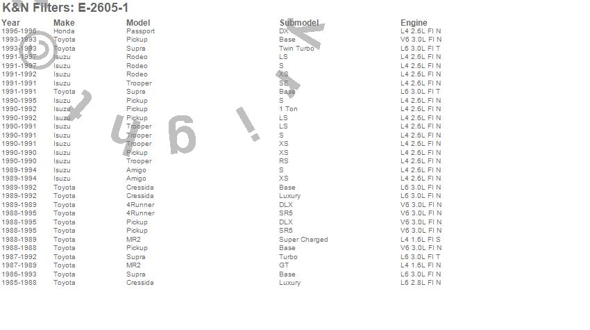 Below is an abbreviated list of applications for the Air Filter.4Runner, Amigo, Cressida, MR2, Pickup, Rodeo, Supra, Trooper, Isuzu, Toyota, 1997, 1996, 1995, 1994, 1993, 1992, 1991, 1990, 1989, 1988