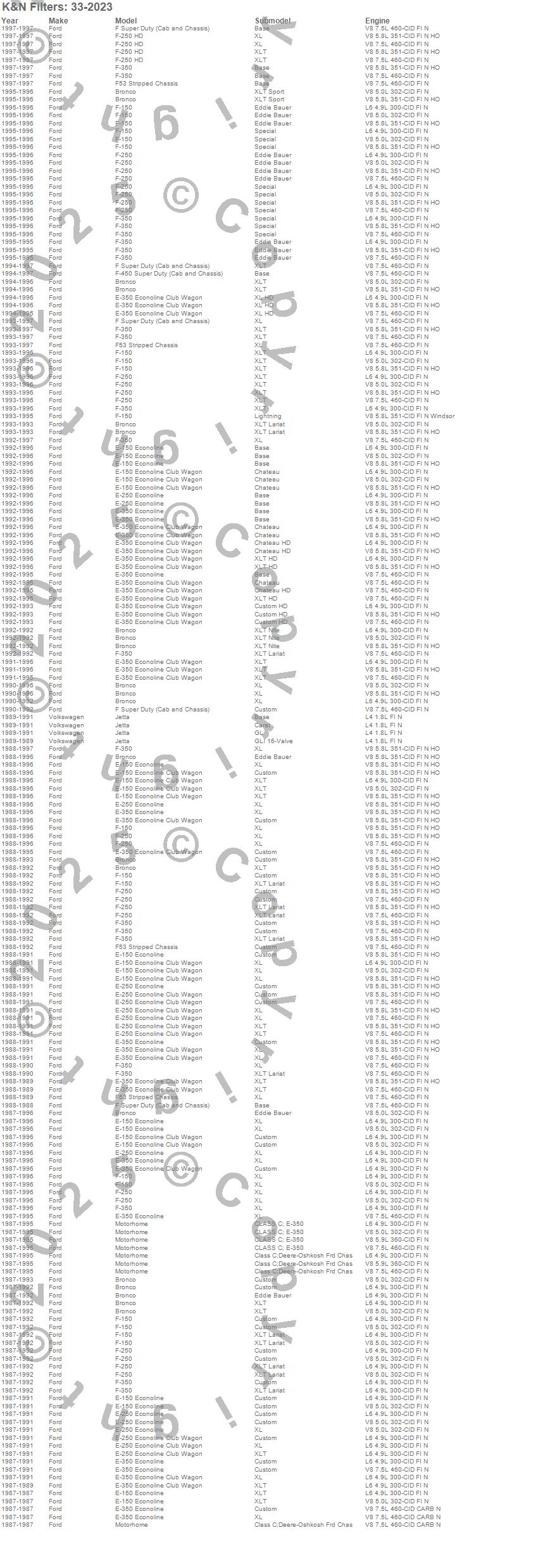 Below is an abbreviated list of applications for the Air Filter.Bronco, E-150 Econoline, E-150 Econoline Club Wagon, E-250 Econoline, E-250 Econoline Club Wagon, E-350 Econoline, E-350 Econoline Club Wagon, F Super Duty, F-150, F-250, F-250 HD, F-350, F-450 Super Duty, F53, Jetta, Motorhome, Ford, Volkswagen, 1997, 1996