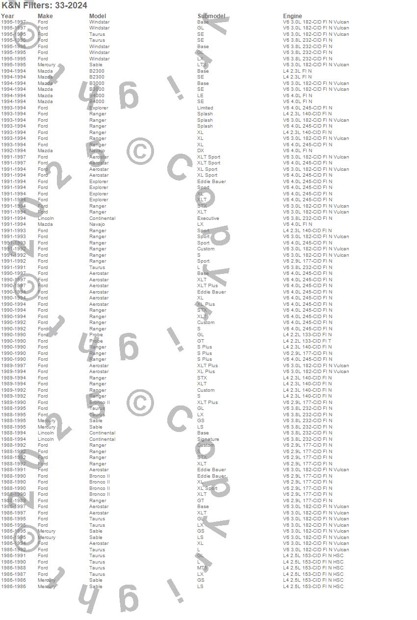 Below is an abbreviated list of applications for the Air Filter.Aerostar, B2300, B3000, B4000, Bronco II, Continental, Explorer, Navajo, Probe, Ranger, Sable, Taurus, Windstar, Ford, Lincoln, Mazda, Mercury, 1997, 1996, 1995