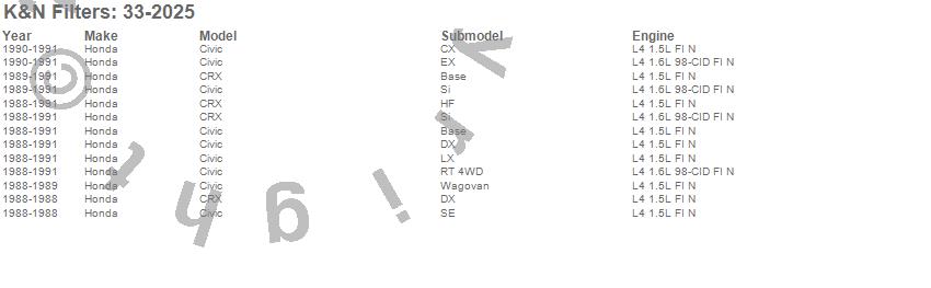 Below is an abbreviated list of applications for the Air Filter.Civic, CRX, Honda, 1991, 1990, 1989, 1988