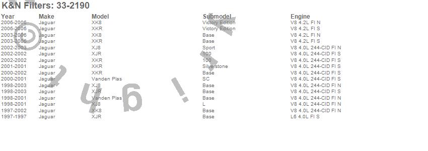 Below is an abbreviated list of applications for the Air Filter.XJ8, XJR, XK8, XKR, Jaguar, 2006, 2005, 2004, 2003, 2002, 2001, 2000, 1999, 1998, 1997