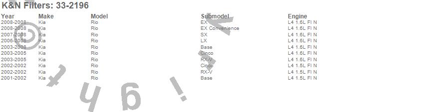 Below is an abbreviated list of applications for the Air Filter.Rio, Kia, 2008, 2007, 2006, 2005, 2004, 2003, 2002, 2001