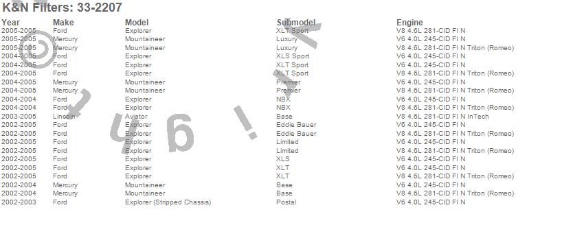Below is an abbreviated list of applications for the Air Filter.Aviator, Explorer, Explorer (Stripped Chassis), Mountaineer, Ford, Lincoln, Mercury, 2005, 2004, 2003, 2002