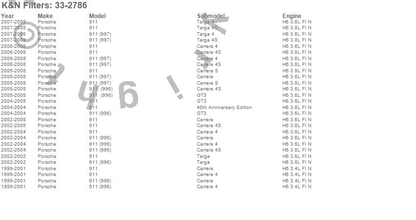 Below is an abbreviated list of applications for the Air Filter.911, Porsche, 2008, 2007, 2006, 2005, 2004, 2003, 2002, 2001, 2000, 1999
