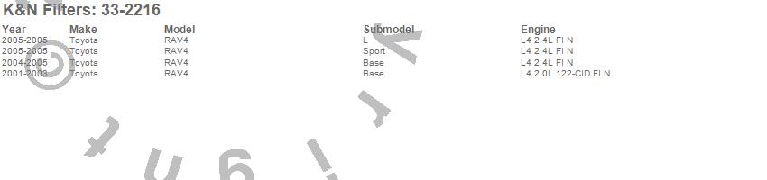 Below is an abbreviated list of applications for the Air Filter.RAV4, Toyota, 2005, 2004, 2003, 2002, 2001