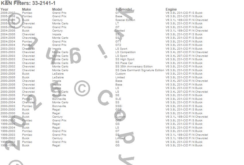 Below is an abbreviated list of applications for the Air Filter.Bonneville, Century, Grand Prix, Impala, LeSabre, Monte Carlo, Regal, Buick, Chevrolet, Pontiac, 2008, 2007, 2006, 2005, 2004, 2003, 2002, 2001, 2000, 1999