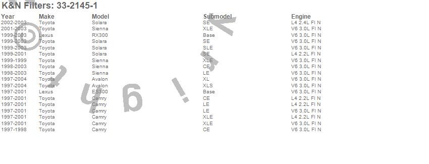 Below is an abbreviated list of applications for the Air Filter.Avalon, Camry, ES300, RX300, Sienna, Solara, Lexus, Toyota, 2004, 2003, 2002, 2001, 2000, 1999, 1998, 1997