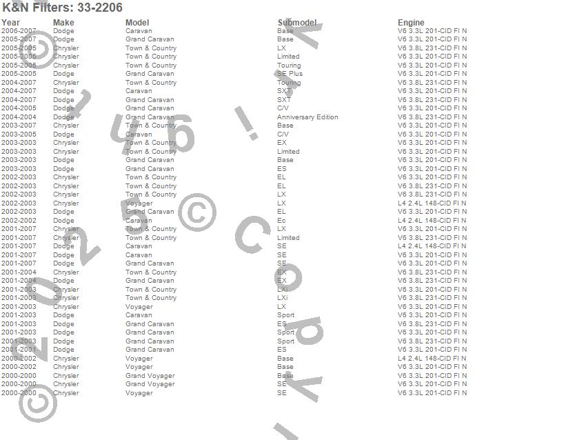 Below is an abbreviated list of applications for the Air Filter.Caravan, Grand Caravan, Grand Voyager, Town & Country, Voyager, Chrysler, Dodge, 2007, 2006, 2005, 2004, 2003, 2002, 2001, 2000