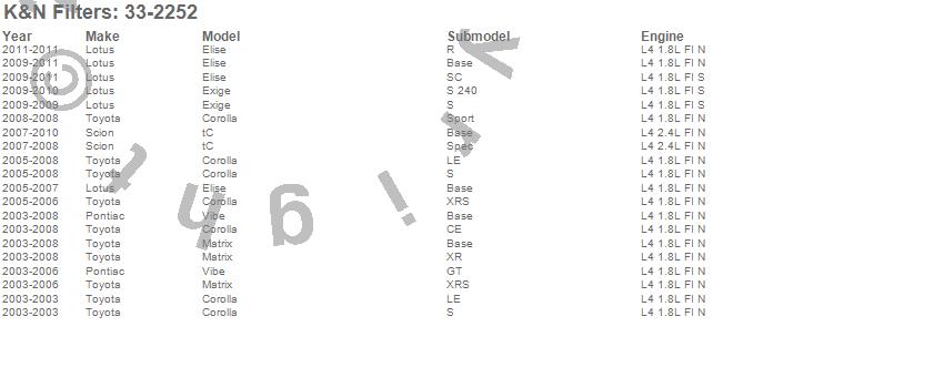 Below is an abbreviated list of applications for the Air Filter.Corolla, Elise, Exige, Matrix, tC, Vibe, Lotus, Pontiac, Scion, Toyota, 2011, 2010, 2009, 2008, 2007, 2006, 2005, 2004, 2003