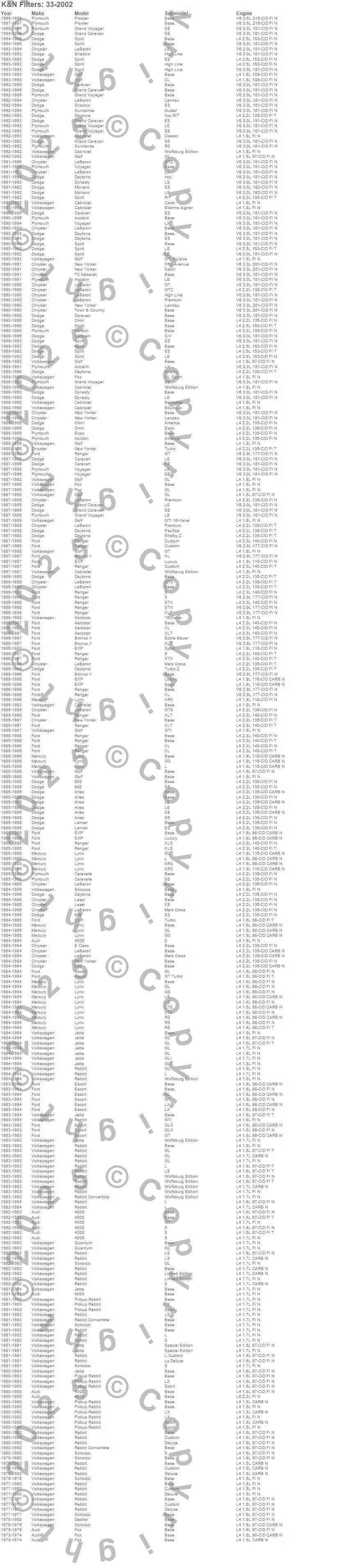 Below is an abbreviated list of applications for the Air Filter.4000, 600, Acclaim, Aerostar, Aries, Bronco II, Cabriolet, Caravan, Caravelle, Dasher, Daytona, Dynasty, E Class, Escort, EXP, Fox, Golf, Grand Caravan, Grand Voyager, Horizon