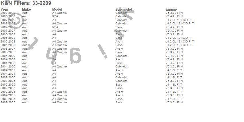 Below is an abbreviated list of applications for the Air Filter.A4, A4 Quattro, RS4, S4, Audi, 2009, 2008, 2007, 2006, 2005, 2004, 2003, 2002