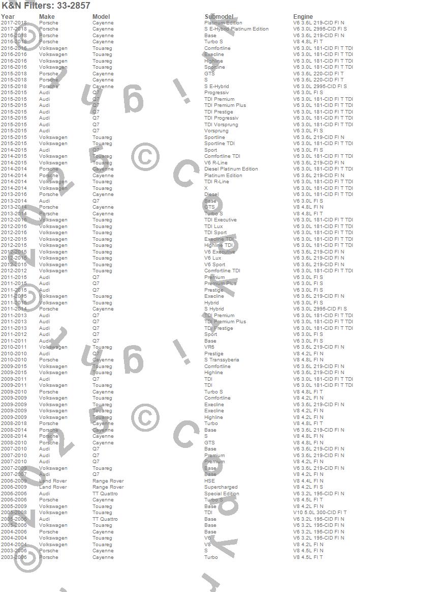 Below is an abbreviated list of applications for the Air Filter.Cayenne, Q7, Range Rover, Touareg, TT Quattro, Audi, Land Rover, Porsche, Volkswagen, 2017, 2016, 2015, 2014, 2013, 2012, 2011, 2010, 2009, 2008, 2007