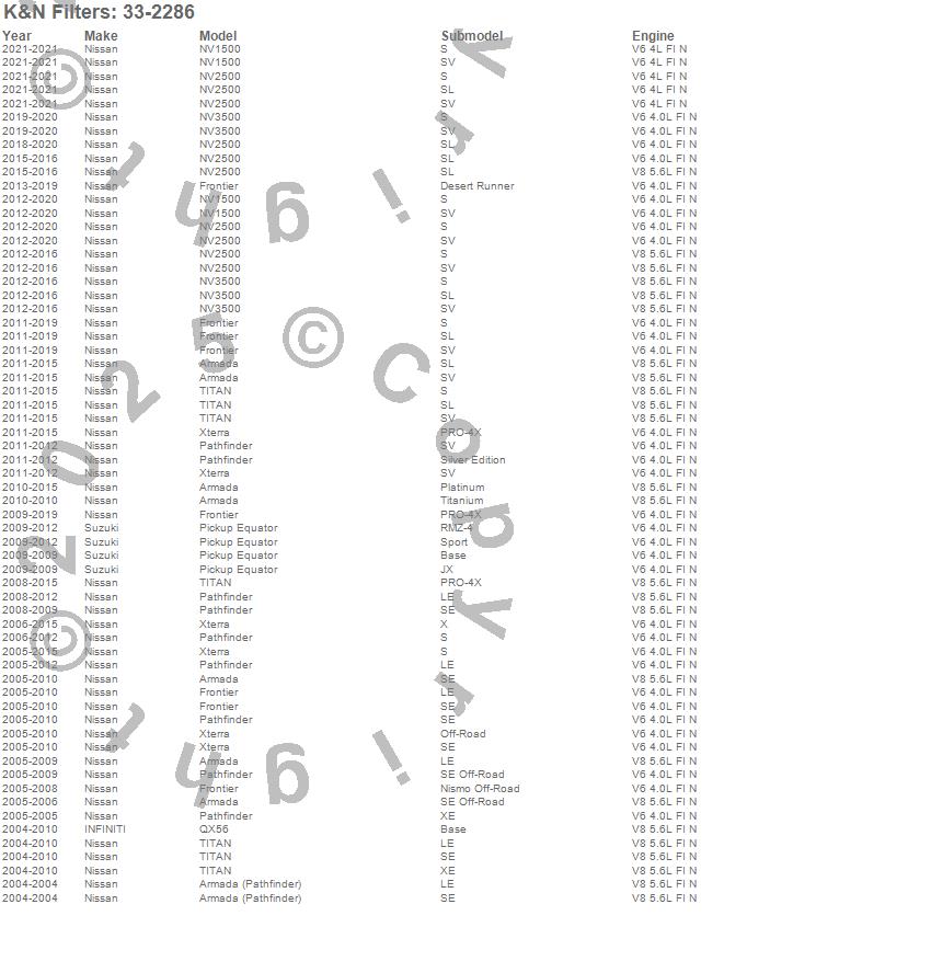 Below is an abbreviated list of applications for the Air Filter.Armada, Armada (Pathfinder), Equator, Frontier, NV1500, NV2500, NV3500, Pathfinder, QX56, Titan, Xterra, Infiniti, Nissan, Suzuki, 2019, 2018, 2017, 2016, 2015, 2014