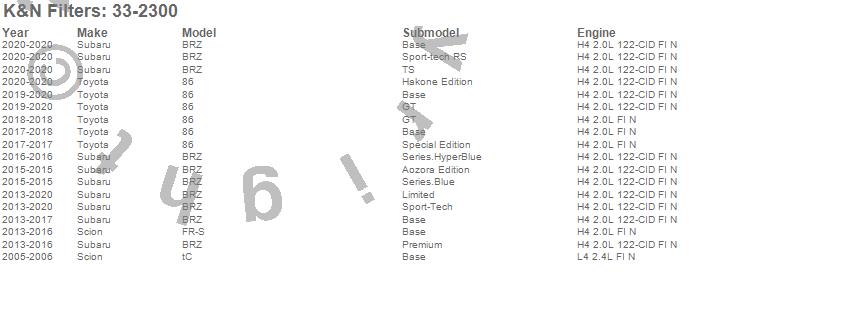 Below is an abbreviated list of applications for the Air Filter.86, BRZ, FR-S, tC, Scion, Subaru, Toyota, 2019, 2018, 2017, 2016, 2015, 2014, 2013, 2006, 2005