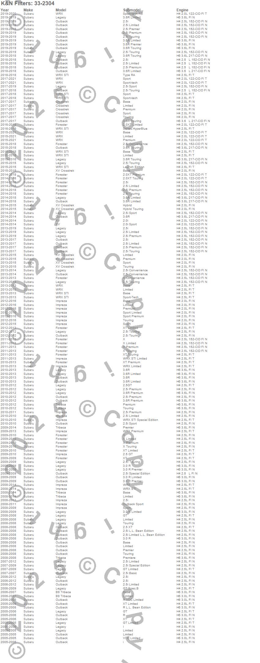 Below is an abbreviated list of applications for the Air Filter.B9 Tribeca, Crosstrek, Forester, Impreza, Legacy, Outback, Tribeca, WRX, WRX STI, XV Crosstrek, Subaru, 2019, 2018, 2017, 2016, 2015, 2014, 2013, 2012, 2011