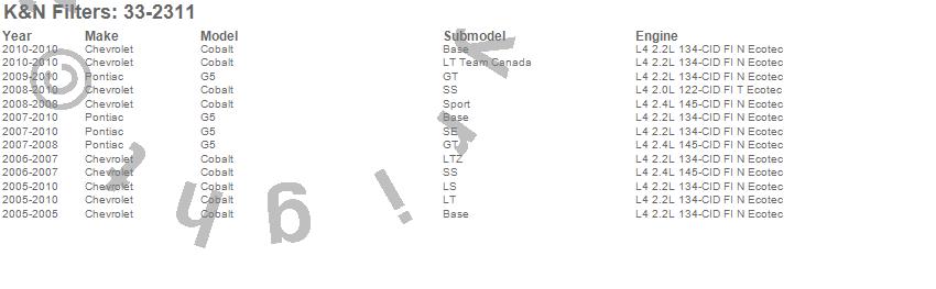 Below is an abbreviated list of applications for the Air Filter.Cobalt, G5, Chevrolet, Pontiac, 2010, 2009, 2008, 2007, 2006, 2005