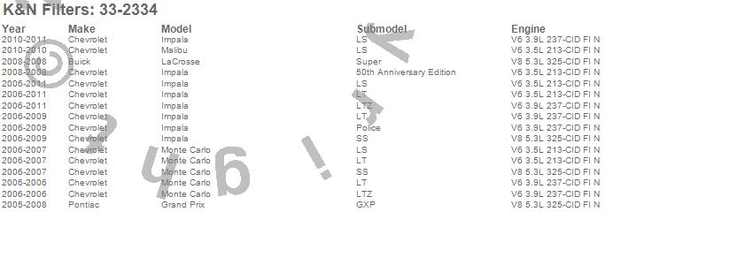Below is an abbreviated list of applications for the Air Filter.Grand Prix, Impala, LaCrosse, Malibu, Monte Carlo, Buick, Chevrolet, Pontiac, 2011, 2010, 2009, 2008, 2007, 2006, 2005