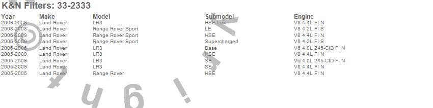 Below is an abbreviated list of applications for the Air Filter.LR3, Range Rover, Range Rover Sport, Land Rover, 2009, 2008, 2007, 2006, 2005