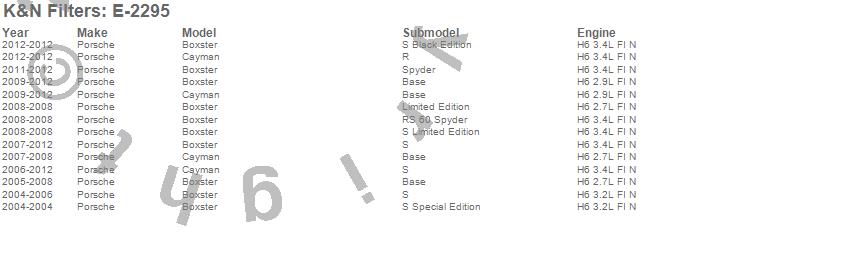 Below is an abbreviated list of applications for the Air Filter.Boxster, Cayman, Porsche, 2012, 2011, 2010, 2009, 2008, 2007, 2006, 2005, 2004