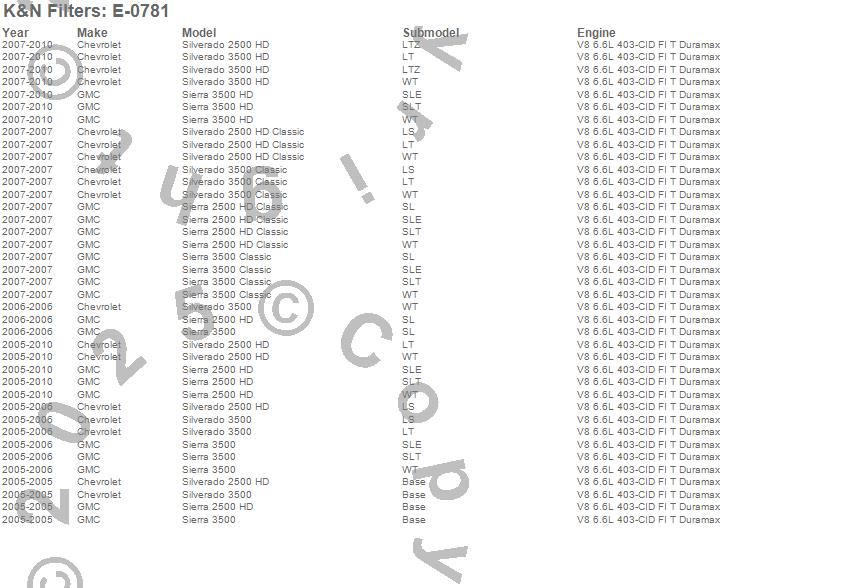Below is an abbreviated list of applications for the Air Filter.Sierra 2500 HD, Sierra 2500 HD Classic, Sierra 3500, Sierra 3500 Classic, Sierra 3500 HD, Silverado 2500 HD, Silverado 2500 HD Classic, Silverado 3500, Silverado 3500 Classic, Silverado 3500 HD, Chevrolet, GMC, 2010, 2009, 2008, 2007, 2006, 2005