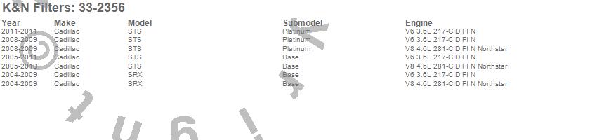 Below is an abbreviated list of applications for the Air Filter.SRX, STS, Cadillac, 2011, 2010, 2009, 2008, 2007, 2006, 2005, 2004