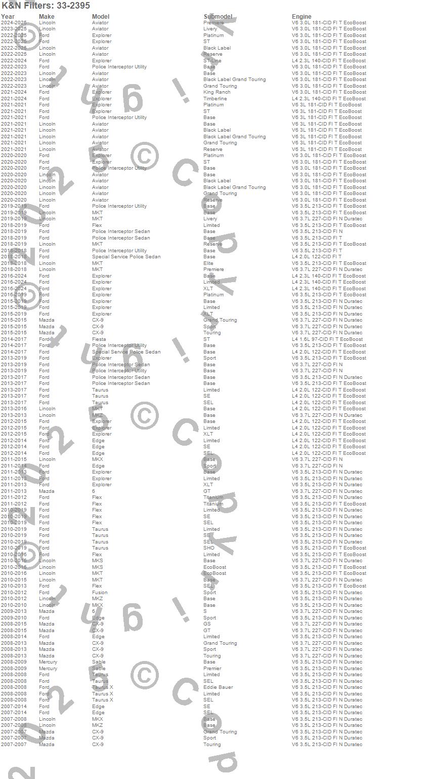 Below is an abbreviated list of applications for the Air Filter.6, CX-9, Edge, Explorer, Flex, Fusion, MKS, MKT, MKX, MKZ, Sable, Taurus, Taurus X, Ford, Lincoln, Mazda, Mercury, 2019, 2018, 2017