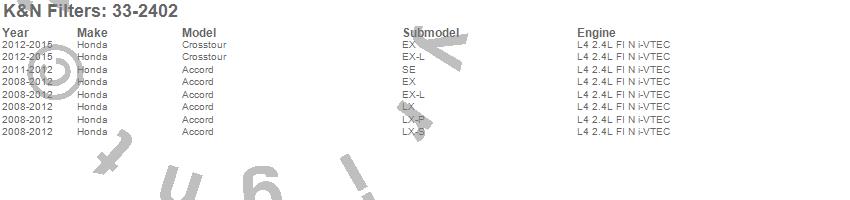 Below is an abbreviated list of applications for the Air Filter.Accord, Crosstour, Honda, 2015, 2014, 2013, 2012, 2011, 2010, 2009, 2008