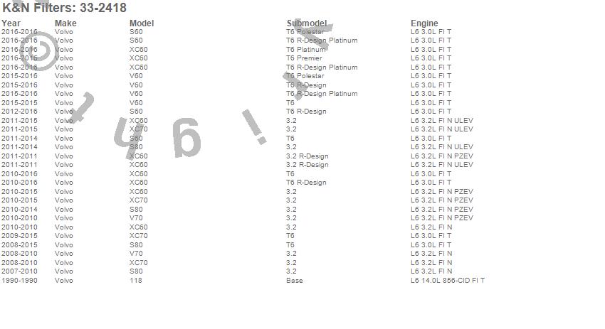 Below is an abbreviated list of applications for the Air Filter.118, S60, S80, V60, V70, XC60, XC70, Volvo, 2016, 2015, 2014, 2013, 2012, 2011, 2010, 2009, 2008, 1990