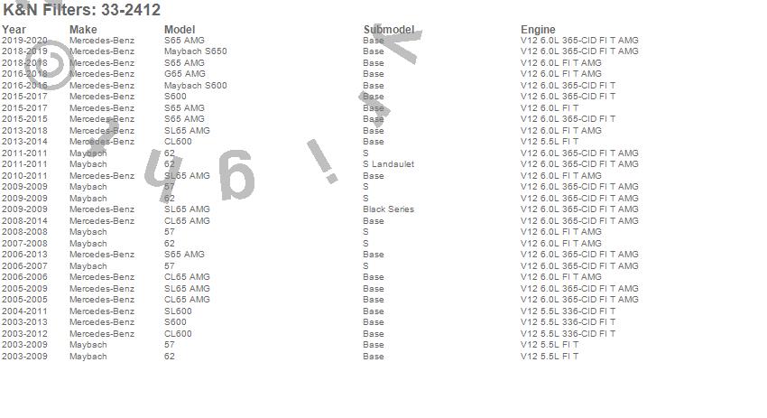 Below is an abbreviated list of applications for the Air Filter.57, 62, CL600, CL65 AMG, G65 AMG, Maybach S600, Maybach S650, S600, S65 AMG, SL600, SL65 AMG, Maybach, Mercedes-Benz, 2019, 2018, 2017, 2016, 2015, 2014, 2013