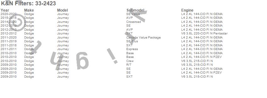 Below is an abbreviated list of applications for the Air Filter.Journey, Dodge, 2019, 2018, 2017, 2016, 2015, 2014, 2013, 2012, 2011, 2010, 2009