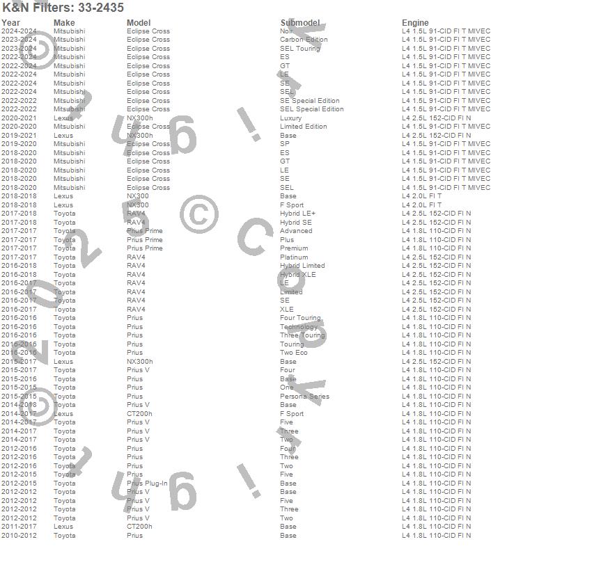 Below is an abbreviated list of applications for the Air Filter.CT200h, Eclipse Cross, NX300, NX300h, Prius, Prius Plug-In, Prius Prime, Prius V, RAV4, Lexus, Mitsubishi, Toyota, 2019, 2018, 2017, 2016, 2015, 2014, 2013, 2012