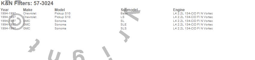 Below is an abbreviated list of applications for the Filtercharger Injection Performance Kit.S10 Pickup, Sonoma, Chevrolet, GMC, 1997, 1996, 1995, 1994