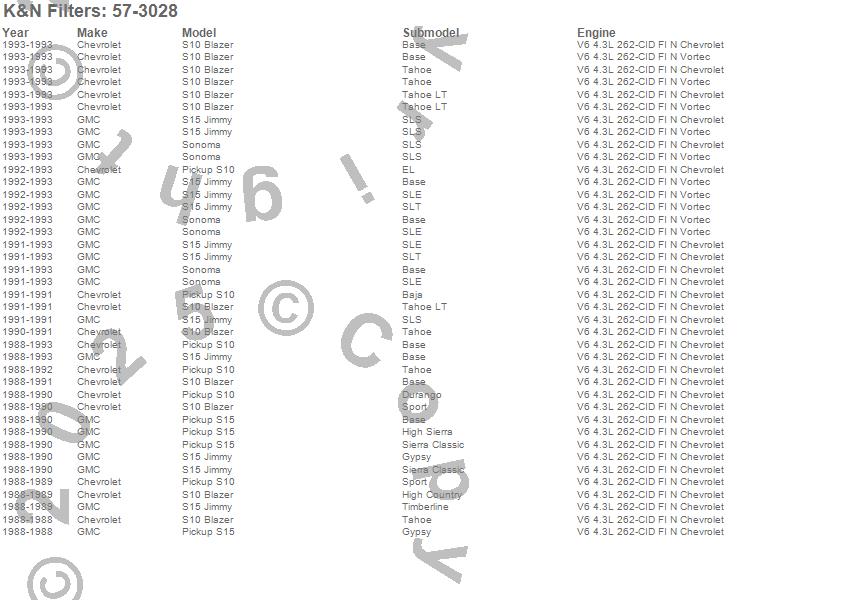 Below is an abbreviated list of applications for the Filtercharger Injection Performance Kit.S10 Blazer, S10 Pickup, S15 Jimmy, S15 Pickup, Sonoma, Chevrolet, GMC, 1993, 1992, 1991, 1990, 1989, 1988
