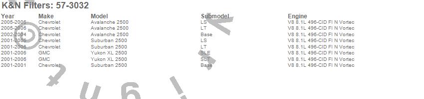 Below is an abbreviated list of applications for the Filtercharger Injection Performance Kit.Avalanche 2500, Suburban 2500, Yukon XL 2500, Chevrolet, GMC, 2006, 2005, 2004, 2003, 2002, 2001