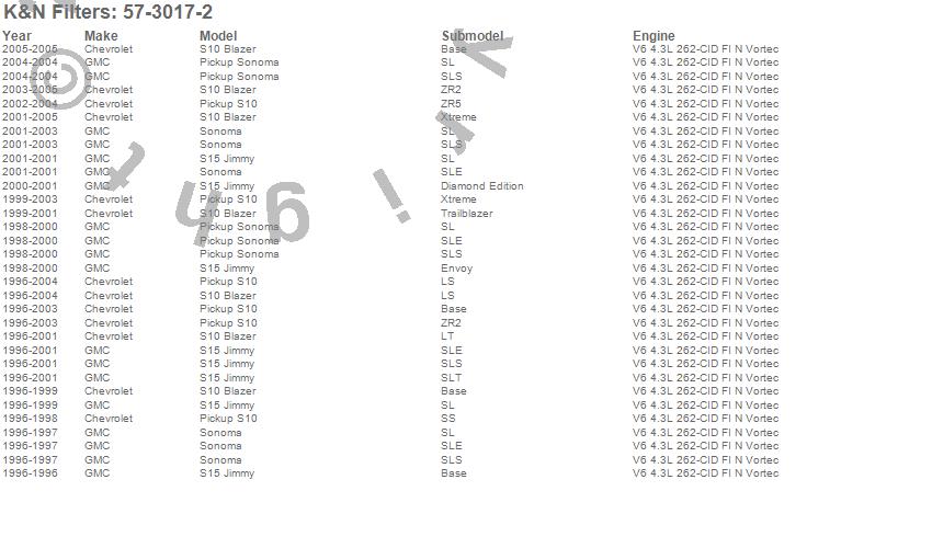 Below is an abbreviated list of applications for the Filtercharger Injection Performance Kit.S10 Blazer, S10 Pickup, S15 Jimmy, Sonoma, Chevrolet, GMC, 2005, 2004, 2003, 2002, 2001, 2000, 1999, 1998, 1997, 1996