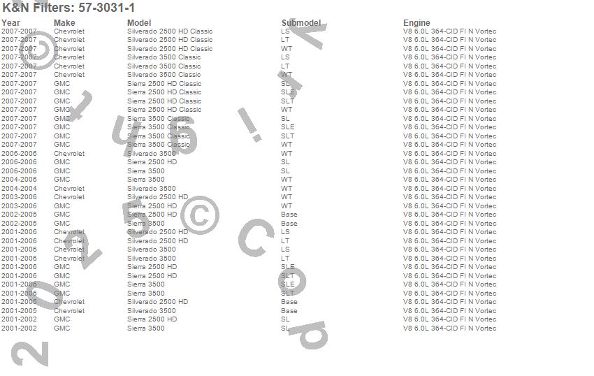 Below is an abbreviated list of applications for the Filtercharger Injection Performance Kit.Sierra 2500 HD, Sierra 2500 HD Classic, Sierra 3500, Sierra 3500 Classic, Silverado 2500 HD, Silverado 2500 HD Classic, Silverado 3500, Silverado 3500 Classic, Chevrolet, GMC, 2007, 2006, 2005, 2004, 2003, 2002, 2001