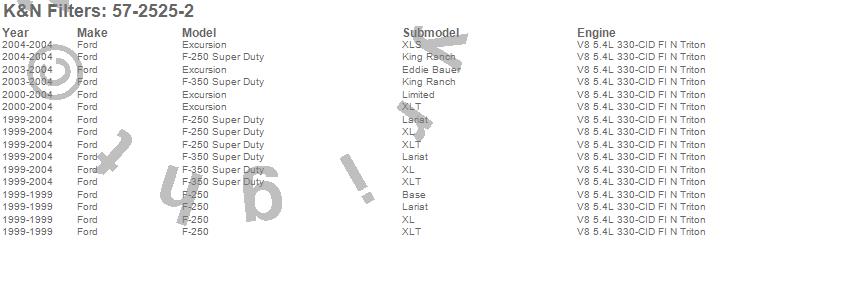 Below is an abbreviated list of applications for the Filtercharger Injection Performance Kit.Excursion, F-250, F-250 Super Duty, F-350 Super Duty, Ford, 2004, 2003, 2002, 2001, 2000, 1999